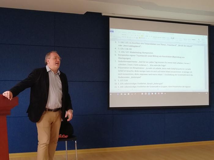 4日至7日,格里查先生就課堂組織的基本原理、課堂設(shè)計(jì)的基本模式、產(chǎn)出導(dǎo)向教學(xué)法、行動(dòng)導(dǎo)向教學(xué)法、以及如何提高學(xué)生課堂參與度等為德語教師舉行了為期4天的教學(xué)法講座,并引導(dǎo)老師進(jìn)行相關(guān)的課堂設(shè)計(jì)。