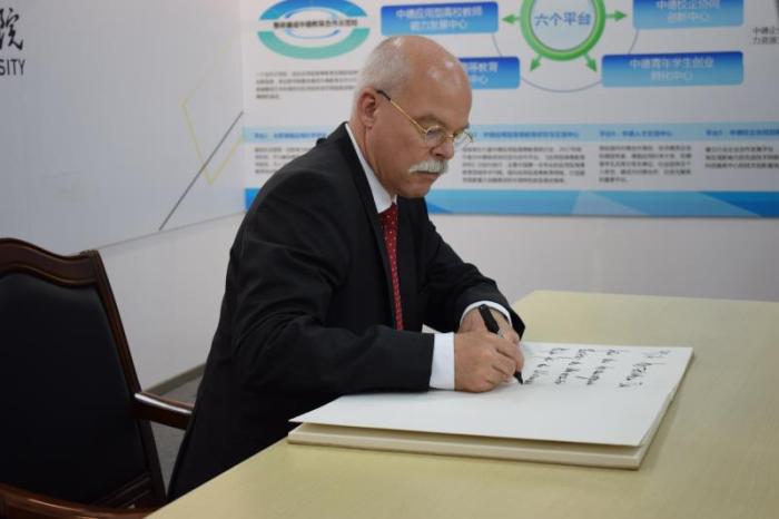 7月8日下午,德國駐華大使葛策博士一行訪問合肥學院。校黨委書記蔡敬民,黨委副書記、校長王其東在中德友誼林熱情會見來賓。德語專業(yè)的學生們手持中德兩國國旗夾道歡迎,葛策博士等人與學生進行親切交談。