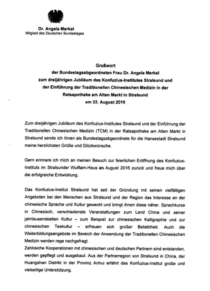 日前,德國施特拉爾松德孔子學(xué)院舉行成立三周年慶典暨施特拉爾松德拉茨藥房中藥配方顆粒部門成立儀式,德國總理默克爾致信祝賀。施特拉爾松德市市長亞歷山大·巴德羅在儀式上宣讀了默克爾賀信。