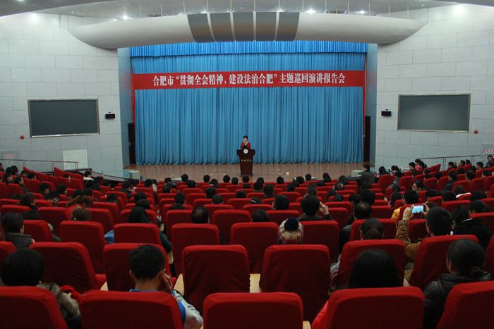 為深入學(xué)習(xí)貫徹黨的十八屆四中全會精神,大力弘揚社會主義法治理念和法治精神。1月13日,合肥市“貫徹全會精神,建設(shè)法治合肥”主題巡回演講報告會于我校二區(qū)圖書館學(xué)術(shù)報告廳A廳舉行,八名進入合肥市決賽的選手為大家?guī)砹司恃葜v。市委宣傳部宣教處副處長魏琪、合肥市經(jīng)開區(qū)工委辦副主任俞光遠、我校黨委宣傳部部長白義香和團委副書記朱濤、包河區(qū)各街道宣傳委員、社區(qū)普法員和宣傳委員以及我校師生共300多人出席報告會。