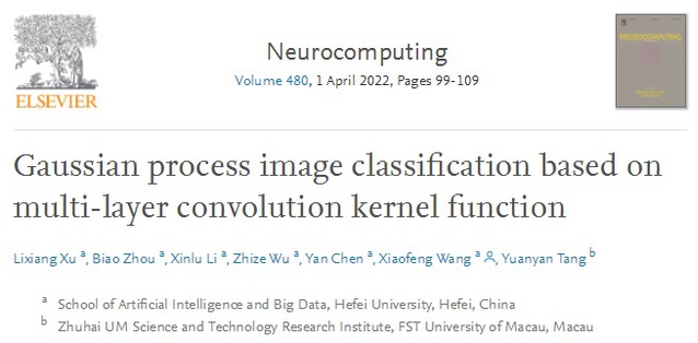 2022年2月,我校人工智能與大數(shù)據(jù)學(xué)院視覺計(jì)算課題組2020級碩士研究生周彪同學(xué)(校內(nèi)導(dǎo)師:王曉峰、徐立祥)的研究成果《Gaussian process image classification based on multi-layer convolution kernel function》被國際期刊《Neurocomputing》在線出版。