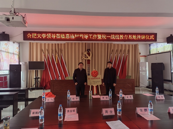 11月15日,合肥大學(xué)“統(tǒng)一戰(zhàn)線教育基地”在泗縣惠廟村舉行揭牌儀式,黨委委員、黨委宣傳統(tǒng)戰(zhàn)部部長(zhǎng)賈峰和惠廟村黨總支書記惠朋共同為基地揭牌?;輳R村山頭鎮(zhèn)黨委委員、宣傳部長(zhǎng)張群,合肥大學(xué)駐惠廟村第一書記周全及校統(tǒng)戰(zhàn)成員代表等參加儀式。