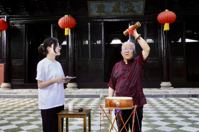 在唐山鎮(zhèn),團(tuán)隊(duì)尋訪了紫金制作工藝省級(jí)非遺傳承人邱金保,通過(guò)訪談,全面了解了紫金硯制作的復(fù)雜工藝,深刻體會(huì)到這一傳統(tǒng)技藝背后的歷史積淀。在壽縣老文化館,團(tuán)隊(duì)專訪了壽州大鼓省級(jí)非遺傳承人魏明華與口技快板非遺傳承人李勛,兩位老師以精彩紛呈的表演,充分展現(xiàn)了壽縣傳統(tǒng)曲藝的獨(dú)特魅力。然而,團(tuán)隊(duì)成員也了解到,非遺傳承正面臨著人才短缺、后繼乏力等嚴(yán)峻形勢(shì),這引發(fā)了他們對(duì)傳統(tǒng)文化保護(hù)與傳承的深刻思考。