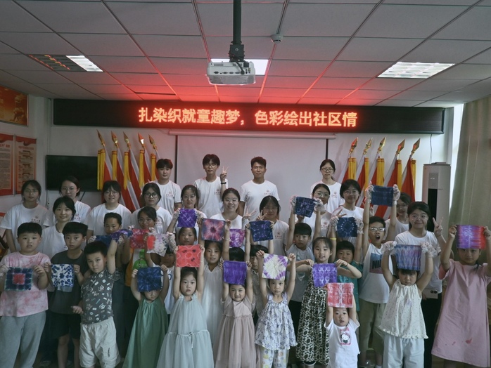 團(tuán)隊(duì)前往潁陽(yáng)社區(qū),開展扎染知識(shí)講解活動(dòng)?;顒?dòng)現(xiàn)場(chǎng),團(tuán)隊(duì)成員借助PPT與實(shí)物展示,向社區(qū)小朋友介紹扎染的歷史、工藝及技巧,并為每位小朋友發(fā)放扎染材料。在隊(duì)員們的指導(dǎo)下,小朋友們對(duì)白色布料進(jìn)行折疊、捆扎,再浸入染料中染色,最終呈現(xiàn)出各具特色的扎染作品。
