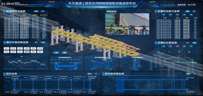該智能頂推安全監(jiān)控系統(tǒng)平臺是由合肥大學(xué)完全自主研發(fā)的在線監(jiān)測系統(tǒng),以結(jié)構(gòu)安全和施工過程預(yù)警為導(dǎo)向,深度融合了物聯(lián)網(wǎng)、大數(shù)據(jù)、云/邊緣計算、人工智能以及數(shù)字孿生等先進(jìn)理念,可廣泛應(yīng)用于橋梁、房屋、隧道、邊坡等結(jié)構(gòu)安全在線監(jiān)測與健康管理。該系統(tǒng)利用云平臺共享技術(shù),通過預(yù)設(shè)無線傳輸設(shè)備模塊,實現(xiàn)了監(jiān)測數(shù)據(jù)融合、三維施工模擬、參數(shù)閾值預(yù)警等多項功能。為了應(yīng)對本次施工安全需求,研究團(tuán)隊等對智能監(jiān)控平臺進(jìn)行了定制化模塊開發(fā),包括鋼箱梁、臨時支架、鋼導(dǎo)梁、步履機(jī)施工過程參數(shù)及現(xiàn)場視頻信息傳輸?shù)饶K建設(shè)。結(jié)合無線傳輸和實時數(shù)據(jù)采集技術(shù),實現(xiàn)了鋼箱梁頂推過程中主要參數(shù)的實時監(jiān)測。經(jīng)過2個多月的現(xiàn)場實踐,智能監(jiān)控系統(tǒng)實時完整記錄并分析了施工階段各項關(guān)鍵參數(shù),為類似橋梁安全施工提供了可靠的數(shù)字化監(jiān)測平臺。