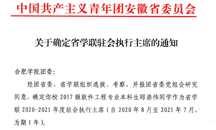 按照《安徽省學(xué)生聯(lián)合會章程》有關(guān)規(guī)定,團省委、省學(xué)聯(lián)于6月啟動2020-2021年度省學(xué)聯(lián)駐會執(zhí)行主席的遴選工作。經(jīng)過團省委、省學(xué)聯(lián)組織選拔、考察并報團省委黨組會研究同意,邱浩偉同學(xué)從安徽省各高校候選人中脫穎而出,當(dāng)選為安徽省學(xué)聯(lián)2020-2021年度駐會執(zhí)行主席,這也是我校學(xué)生首次當(dāng)選省學(xué)聯(lián)駐會執(zhí)行主席。
