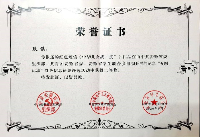 日前,安徽省委組織部、共青團安徽省委、安徽省學生聯(lián)合會公布了《安徽省疫情防控和決戰(zhàn)決勝脫貧攻堅紅色信息征集活動獲獎名單》,我校先進制造工程學院學生工作辦公室主任耿俁老師的作品《中華兒女戰(zhàn)“疫”》(詩歌)榮獲二等獎。