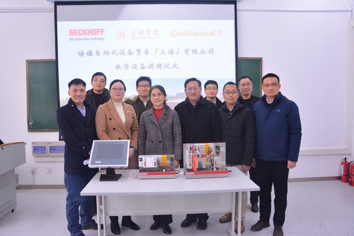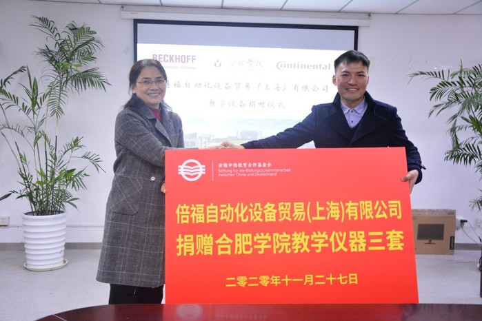 11月27日下午,倍福自動(dòng)化設(shè)備貿(mào)易(上海)有限公司教學(xué)設(shè)備捐贈(zèng)儀式在我校40棟會(huì)議室舉行。副校長(zhǎng)、安徽中德教育合作基金會(huì)(以下簡(jiǎn)稱基金會(huì))理事長(zhǎng)陳秀出席捐贈(zèng)儀式,倍福自動(dòng)化設(shè)備貿(mào)易(上海)有限公司代表張洪彪、葛長(zhǎng)響,大陸馬牌公司代表汪鑫,校計(jì)劃財(cái)務(wù)處處長(zhǎng)、基金會(huì)秘書長(zhǎng)何世昆以及中德教育合作示范基地(基金)管理辦公室主任劉金平等參加了捐贈(zèng)儀式。儀式由先進(jìn)制造工程學(xué)院院長(zhǎng)呂剛主持。