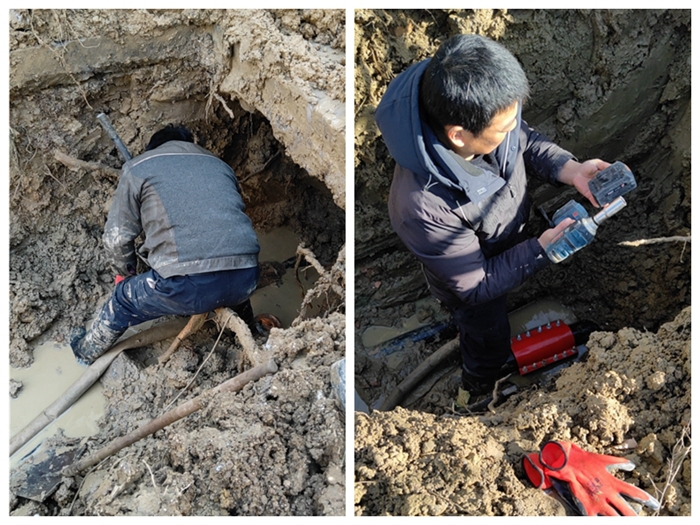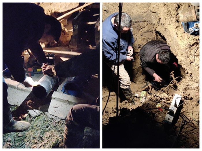當天下午,工作人員發(fā)現(xiàn)34號樓附近地面有水上冒,立刻電話告知。由于地下焊接需在無水狀態(tài)下進行,高層供水總閥緊急關閉。為不影響正常的教學秩序并盡快恢復正常供水,工作人員選擇在夜間對破損管道進行維修,迅速調動車力、人力,準備維修設備和材料,對冒水路段進行開挖,對破損管道進行更換、整修并對道路進行回填修復。經過10個小時的奮戰(zhàn),終于在晚間11點將斷裂管道維修完畢并恢復供水。