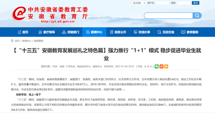 近期,省教育廳官網推出“十三五”安徽教育發(fā)展巡禮報道之特色篇《強力推行“1+1”模式 穩(wěn)步促進畢業(yè)生就業(yè)》,報道中多次提及我校的就業(yè)創(chuàng)業(yè)工作措施和成效。