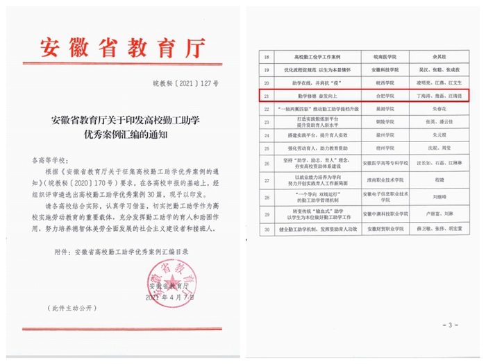 近日,安徽省教育廳下發(fā)《關(guān)于印發(fā)高校勤工助學(xué)優(yōu)秀案例匯編的通知》,合肥學(xué)院選送勤工助學(xué)案例《勤學(xué)修德奮發(fā)向上》被遴選為高校勤工助學(xué)優(yōu)秀案例,在全省高校推廣學(xué)習(xí)。