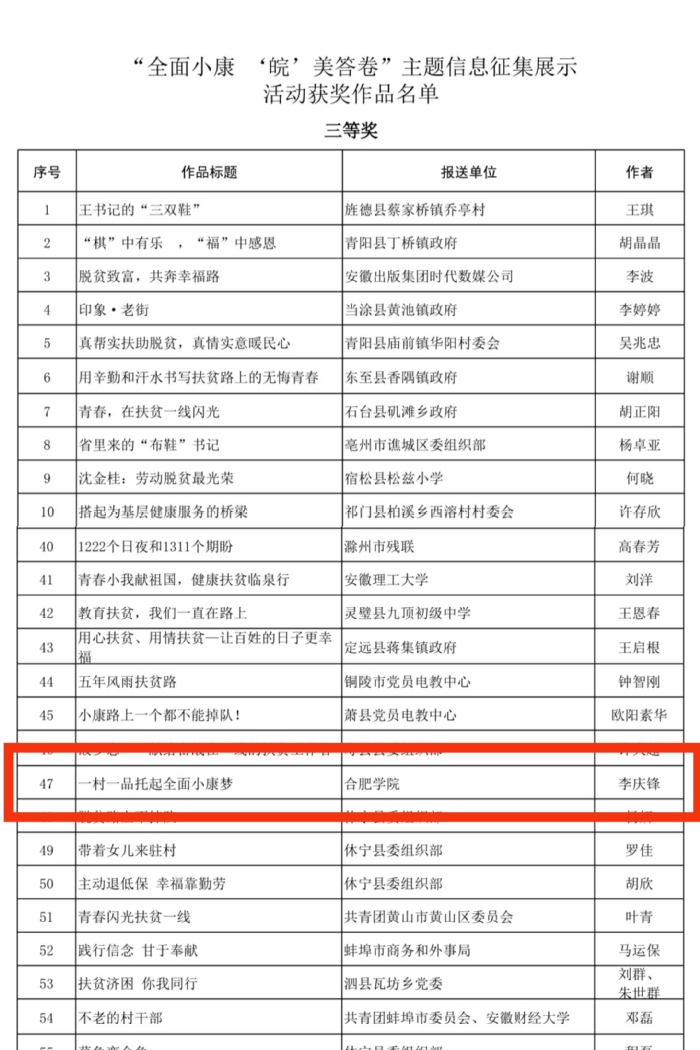 日前,安徽先鋒網(wǎng)公示了“全面小康 ‘皖’美答卷”主題信息征集展示活動(dòng)獲獎(jiǎng)作品名單。此次活動(dòng)共收到文字類、圖片類和視頻類作品1170件,經(jīng)過(guò)網(wǎng)上展評(píng)、專家評(píng)審等階段,最終有120件作品脫穎而出,評(píng)定特等獎(jiǎng)10名,一等獎(jiǎng)20名、二等獎(jiǎng)30名、三等獎(jiǎng)60名。合肥學(xué)院經(jīng)濟(jì)與管理學(xué)院18級(jí)物流管理專業(yè)李慶鋒同學(xué)創(chuàng)作的《一村一品托起全面小康夢(mèng)》短視頻作品榮獲三等獎(jiǎng)。