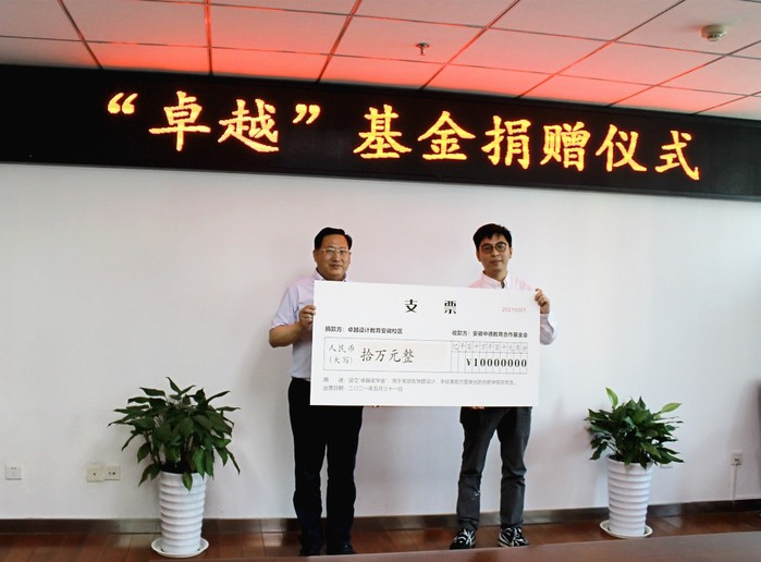 捐贈(zèng)儀式上,雙方簽訂捐贈(zèng)協(xié)議。汪若逸代表卓越設(shè)計(jì)教育安徽校區(qū)向基金會(huì)遞送捐贈(zèng)支票。何世昆代表基金會(huì)向卓越設(shè)計(jì)教育安徽校區(qū)頒發(fā)捐贈(zèng)證書。