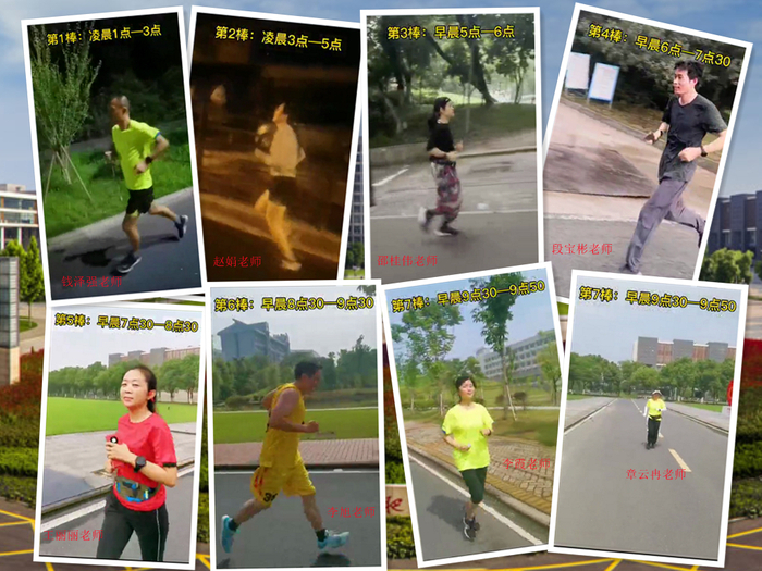 正值期末階段,老師們的工作任務(wù)較為繁重,為了不影響正常工作,經(jīng)過管梅、錢澤強(qiáng)、趙娟等老師前期的仔細(xì)籌劃,將6月28日凌晨1點定為此次悅跑接力百公里活動的啟動時間。按照既定的分時段安排,錢澤強(qiáng)、趙娟、邵桂偉、段寶彬、王麗麗、李旭、李霞、章云冉等老師順利完成了接力跑。