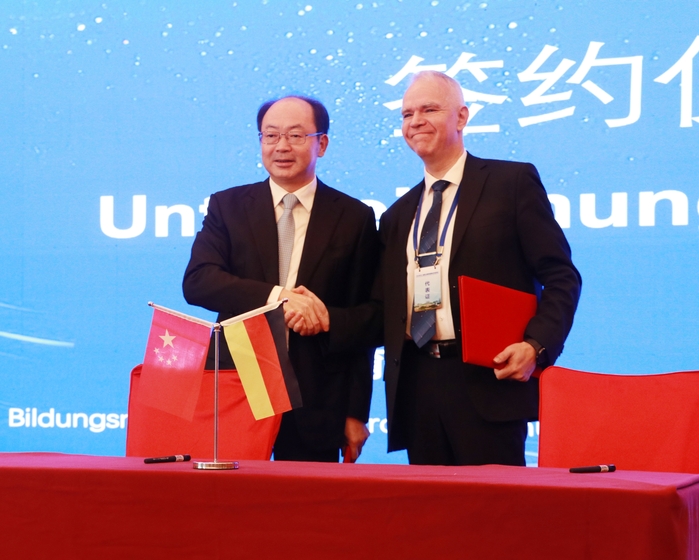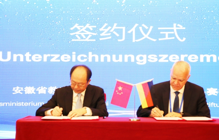 大會(huì)舉行了簽約儀式,錢(qián)桂侖和喬治·施泰德作為雙方代表簽訂了合作協(xié)議。未來(lái)雙方將圍繞“教學(xué)方案研討”、“提升教師教學(xué)以及實(shí)踐能力”、“引入以實(shí)踐為導(dǎo)向教學(xué)理念”為主題的師資培訓(xùn),建立建設(shè)能力培訓(xùn)中心,建立教學(xué)質(zhì)量管理體系等方面開(kāi)展合作,進(jìn)一步增進(jìn)中德兩國(guó)在教育領(lǐng)域的交流與友誼,促進(jìn)安徽省職業(yè)教育發(fā)展。