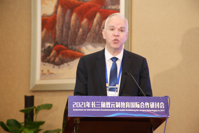 喬治·施泰德在題為《發(fā)展——合作——?jiǎng)?chuàng)新 過(guò)去、現(xiàn)在與未來(lái)》的報(bào)告中指出,高校是教育的核心部分,職業(yè)教育引領(lǐng)創(chuàng)新之路。中德合作由來(lái)已久,他希望能與更多高校建立良好的溝通合作關(guān)系,運(yùn)用雙元制教育模式,推動(dòng)人才培養(yǎng)方案改革創(chuàng)新,使學(xué)生的綜合能力和專(zhuān)業(yè)技能不斷提高,讓中國(guó)更多的職業(yè)院校受益。