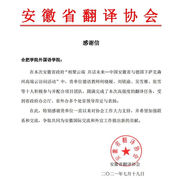 7月16日下午,安徽省與德國下薩克森州以視頻方式舉行“相聚云端共話未來—中國安徽省與德國下薩克森州高端云訪問活動”。期間我校外國語學院德語專業(yè)師生積極投身各項翻譯工作,為中德友好省州活動順利開展交出了一份滿意的答卷。