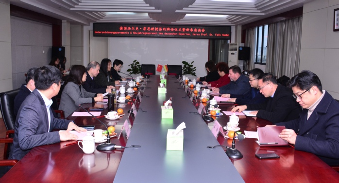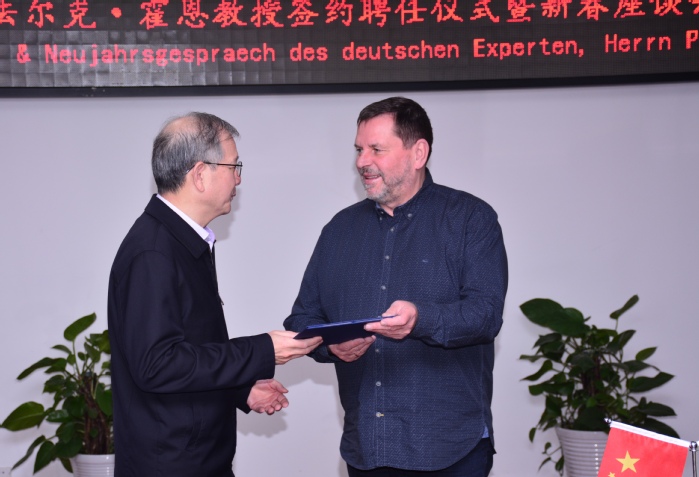 2月10日上午,我校在行政樓九樓東會議室舉辦外籍教授聘任儀式暨新春座談會,來自德國漢諾威應(yīng)用科學(xué)大學(xué)的法爾克·霍恩受聘為學(xué)校外籍教授。黨委書記王其東、院長吳春梅出席儀式,組織部、教務(wù)處、人事處、國際交流合作處、研究生處、設(shè)計(jì)學(xué)院、外國語學(xué)院等相關(guān)單位負(fù)責(zé)人參加儀式。王其東給霍恩教授頒發(fā)聘書,人事處處長紀(jì)平代表學(xué)校與霍恩教授簽訂聘任協(xié)議。