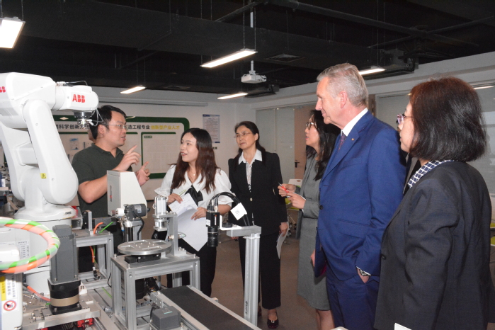 武爾夫一行還參觀了大眾學(xué)院校企實(shí)訓(xùn)平臺(tái),在多模態(tài)設(shè)備健康評(píng)估實(shí)驗(yàn)室、智能制造系統(tǒng)集成技術(shù)應(yīng)用及創(chuàng)新中心、數(shù)字孿生技術(shù)及工程應(yīng)用中心調(diào)研了學(xué)科建設(shè)、模塊化課程、實(shí)訓(xùn)教學(xué)等情況,高度肯定了我?!暗胤叫?、應(yīng)用型、國(guó)際化”的辦學(xué)定位。