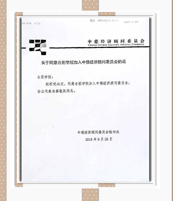 Am 28.09.2016 erteilte der chinesisch-deutsche beratende Wirtschaftsausschuss des chinesischen Handelsministeriums in einem offiziellen Schreiben an die Universit?t Hefei die offizielle Genehmigung zu ihrer Beteiligung am chinesisch-deutschen beratenden Wirtschaftsausschuss. Als Vertreter wurde der Parteisekret?r der Universit?t Hefei, Prof. Cai Jingmin, ernannt. Die Universit?t Hefei gilt als der erste Hochschulvertreter des Wirtschaftsausschusses und wird im Oktober an der Rundtisch-Konferenz zur industriellen Zusammenarbeit zwischen Deutschland und China (Provinz Anhui) in Peking teilnehmen.