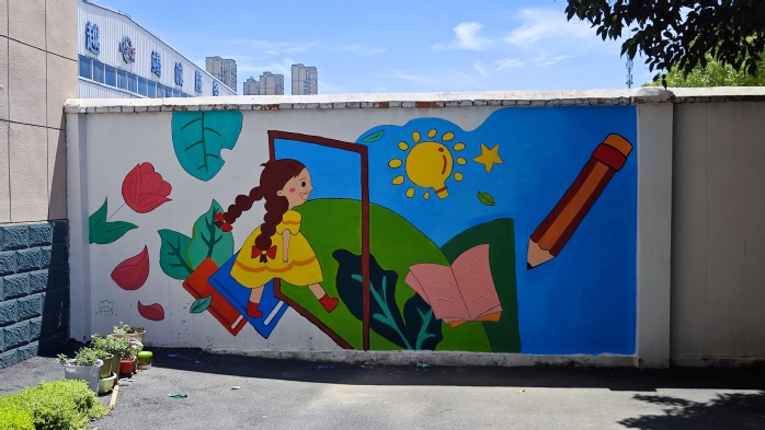 團(tuán)隊(duì)成員帶領(lǐng)學(xué)生們參觀學(xué)校閱覽室,并向閱覽室捐贈了書籍;為校園里的植物掛上了親手繪制的木制銘牌,美化了校園環(huán)境,讓學(xué)生們學(xué)到了許多植物知識。經(jīng)過前期的構(gòu)思,團(tuán)隊(duì)成員們在學(xué)校的墻上繪制彩繪,并結(jié)合課程元素繪制了黑板畫。
