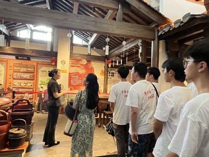 績(jī)溪是徽菜的發(fā)源地之一,7月17日下午,調(diào)研組的同學(xué)參觀(guān)了徽菜博物館,在講解員的帶領(lǐng)下,同學(xué)們逐一參觀(guān)各個(gè)展區(qū),詳細(xì)了解了徽菜的歷史淵源、發(fā)展歷程以及烹飪技藝,對(duì)徽菜文化的深厚底蘊(yùn)有了更深刻的認(rèn)識(shí),領(lǐng)略到徽州的風(fēng)土人情和燦爛的徽州文化。