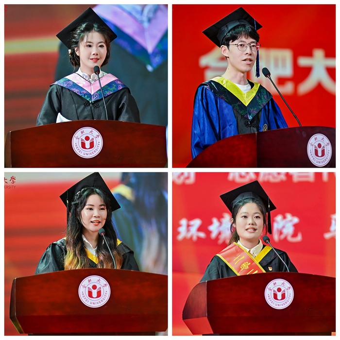 本科生畢業(yè)生代表朱茜茹、研究生畢業(yè)生代表李小凡、留學生畢業(yè)生代表蘇珍秋、“西部計劃”畢業(yè)生志愿者代表馬慧子、教師代表肖赟教授相繼發(fā)言。朱茜如表示將以校訓“厚德、博學、善思、致用”為精神動力,不負偉大時代,交上一份無愧于“合大人”的青春答卷。李小凡表示,將作為基層選調(diào)生積極把技術融入鄉(xiāng)村治理,把論文寫在祖國大地上。蘇珍秋感恩合大培養(yǎng)及“一帶一路”倡議帶來的機遇,立志成為中柬文化交流橋梁。馬慧子承諾扎根新疆基層,以“功成必定有我”的擔當投身西部建設。肖赟贈言畢業(yè)生“保持自信、學習、溫情”,以中科院院士逆境成長為例,勉勵做有溫度的時代青年。