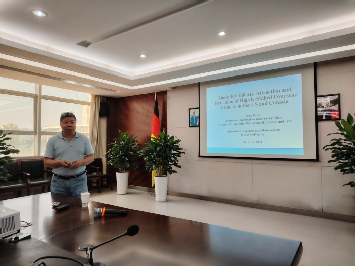 方濤教授以“Attraction and retention of highly skilled overseas Chinese in the United States and Canada”(《美國和加拿大對海外華人高端人才的吸引與留用研究》)為題給經(jīng)濟與管理學院師生做了一場精彩的學術報告。他結(jié)合豐富的研究數(shù)據(jù)與案例,深入剖析美加兩國吸引和留住海外華人高技能人才的策略。報告結(jié)束后,方濤與經(jīng)濟與管理學院師生、德籍教授湯衛(wèi)思進行座談,就國際人才流動趨勢、區(qū)域經(jīng)濟發(fā)展與人才政策等議題展開討論,碰撞出諸多思想火花。