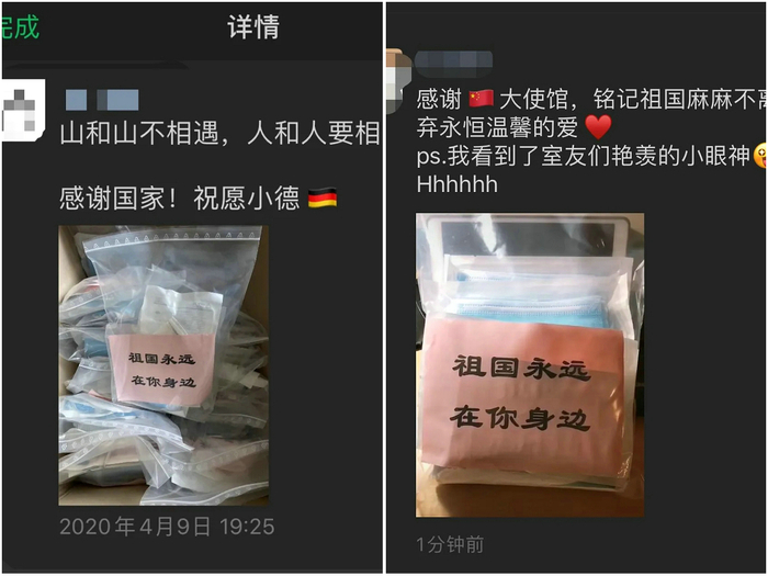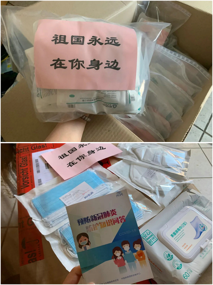 “愛(ài)心防疫包”包含N95口罩兩只、醫(yī)用外科口罩兩盒共二十只、表面消毒巾一包及《新冠防疫知識(shí)問(wèn)答手冊(cè)》一份。在德國(guó)市場(chǎng)防疫物資相對(duì)匱乏的時(shí)刻,這份母愛(ài)顯得尤為珍貴。同學(xué)們?cè)诰W(wǎng)上和朋友圈紛紛曬出圖片,表達(dá)對(duì)祖國(guó)溫情的感激,對(duì)使領(lǐng)館、在德物資提供企業(yè)及學(xué)聯(lián)工作人員奉獻(xiàn)愛(ài)心辛苦工作的感謝,并衷心祝愿祖國(guó)繁榮昌盛,祝福德國(guó)早日走出疫情的陰霾!