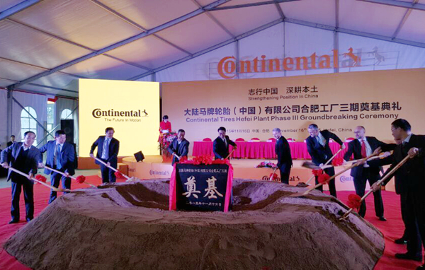 當(dāng)日,合肥市市長(zhǎng)張慶軍、大陸集團(tuán)輪胎事業(yè)部執(zhí)行副總裁博卡·科勒、合肥海關(guān)副關(guān)長(zhǎng)賈江、大陸集團(tuán)乘用車胎部亞太區(qū)執(zhí)行副總裁馮賀飛、合肥市常務(wù)副市長(zhǎng)韓冰等出席了奠基典禮。