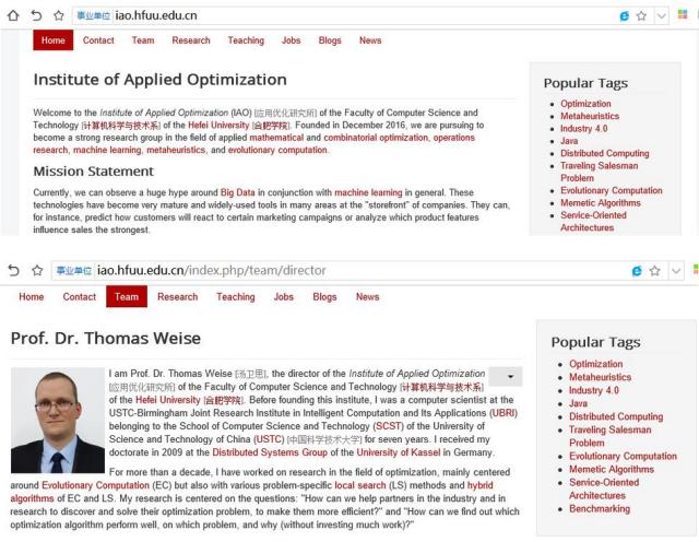 湯衛(wèi)思(Tomas Weise)教授,于德國(guó)完成博士學(xué)業(yè)后,先后七年在中國(guó)高校完成博士后及副教授崗位工作,在計(jì)算機(jī)數(shù)據(jù)處理及方案優(yōu)化領(lǐng)域,研究能力強(qiáng)勁,先后在國(guó)際知名權(quán)威學(xué)術(shù)雜志發(fā)表多篇具有影響力的文章,并參與和執(zhí)行有多項(xiàng)中國(guó)國(guó)家自然科學(xué)基金等項(xiàng)目。湯衛(wèi)思教授目前被引進(jìn)我校,于我校計(jì)算機(jī)科學(xué)與技術(shù)系牽頭成立“應(yīng)用優(yōu)化研究所(IAO)”,迅速開展啟動(dòng)多項(xiàng)研究工作。此外,他還利用個(gè)人學(xué)術(shù)領(lǐng)域影響力,廣泛宣傳我校中德教育合作示范基地,為我校引進(jìn)更多國(guó)際化高層次人才。