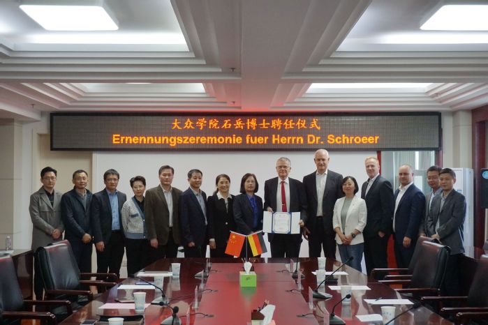 石岳博士感謝學(xué)校對他的信任,聘請其為特聘教授。他表示,非常高興能再回到中國并利用自己的專業(yè)知識為學(xué)校與大眾集團(tuán)的合作做貢獻(xiàn)。今后將作為紐帶,推動大眾集團(tuán)與學(xué)校的深度合作,將豐富的實踐經(jīng)驗和創(chuàng)新思維帶到課堂,為學(xué)校全面提升人才培養(yǎng)質(zhì)量添新亮點。