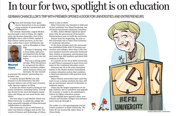 10月30日,國務(wù)院總理李克強與德國總理默克爾訪問安徽省會合肥,參觀了合肥學(xué)院并共同出席一系列重要活動。11月6日,在合肥學(xué)院任教的德國專家穆拉德·阿拉米(Mourad Alami)在中國日報社主辦的《中國日報歐洲版》(China Daily European Weekly)上發(fā)表評論文章《中德總理訪問合肥,教育合作成焦點》(In tour for two, spotlight is on education)。