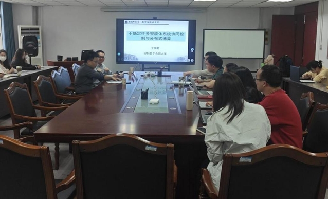 2025年5月8日下午,人工智能與大數(shù)據(jù)學(xué)院邀請安徽師范大學(xué)博士生導(dǎo)師王佩君教授在37號樓305會(huì)議室為我院師生作學(xué)術(shù)報(bào)告,報(bào)告主題為“不確定性多智能體系統(tǒng)協(xié)同控制與分布式博弈”,科研處副處長王磊教授、數(shù)學(xué)與統(tǒng)計(jì)系閆曉輝教授、部分青年博士教師及數(shù)學(xué)學(xué)科全體碩士研究生參加此次報(bào)告會(huì),本次報(bào)告由王磊教授主持。