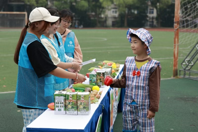 親子互動(dòng)的“蔬果奧運(yùn)會(huì)” 熱鬧非凡,南瓜保齡球、玉米接力賽等項(xiàng)目,讓家長(zhǎng)與孩子攜手在歡樂中競(jìng)技,獲勝者可兌換環(huán)保小禮物,既增進(jìn)了親子關(guān)系,又激發(fā)了大家參與環(huán)保的熱情?!芭f物大變身” 區(qū)域,學(xué)生黨員帶領(lǐng)大家將舊衣服改造成帆布袋、編織地墊,讓廢舊物品煥發(fā)新生,生動(dòng)詮釋了循環(huán)利用的環(huán)保理念。