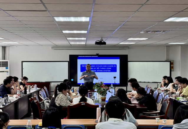 2025年6月24日上午,“分段光滑系統(tǒng)理論及其應(yīng)用天元數(shù)學(xué)講習(xí)班”系列課程邀請華南理工大學(xué)二級教授、博士生導(dǎo)師楊啟貴教授37號樓305教室為天元班學(xué)員作短課程報告,報告主題為“非光滑系統(tǒng)同宿軌、奇異環(huán)與混沌復(fù)雜性”。本次報告由學(xué)院黨委書記牛欣教授主持。