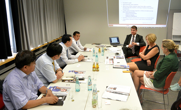 8月29日上午,代表團到訪位于德國威廉港的雅德大學,與該校校長瓦爾森斯教授、外辦主任梅恩女士等就兩校2+3專業(yè)共建、學生交流等后續(xù)合作事宜進行了討論,并會見了我校于當?shù)貙W習的近20位留學生代表,詳細了解了他們的學習和生活情況,并鼓勵他們發(fā)揚我校留德前輩的刻苦精神,爭取在學業(yè)和工作上取得更大突破。代表團一行還于威廉港拜訪了我校德籍合作老專家邁勒斯教授,蔡敬民書記向其介紹了學校對德合作,特別是基地建設的進展情況。29日下午,代表團繼續(xù)訪問羅斯托克大學,并與我校德籍客座教授、中國政府友誼獎獲得者萊勒斯教授,以及該校國際辦公室主任帕爾魯斯先生,就兩校開展德語教師交流培訓、德語教學合作、環(huán)保與生物質能源領域協(xié)同創(chuàng)新平臺建設等事宜進行了意見交流。30日上午,蔡敬民一行來到施特拉爾松德,在籌備我校孔子學院揭牌活動前期,與施特拉爾松德應用科學大學校長、中國政府友誼獎獲得者、我??妥淌诨舳?,以及該校副校長皮特森教授,就兩校未來合作的重點領域及孔子學院事宜進行了交流。31日上午,蔡敬民書記率代表團拜訪安哈爾特應用科學大學,該校新任校長巴格丹教授、我校德籍客座教授凱爾斯騰等人給予了接待。蔡敬民首先對巴格丹教授新任校長一職表示了祝賀,并對凱爾斯騰教授生日當天接待我校代表團一行表示感謝和祝賀,并介紹了我校中德基地建設的發(fā)展情況。巴格丹校長表示期望于近期訪問合肥學院并期待安哈爾特應用科學大學可以在中德基地建設領域發(fā)揮作用。9月6日上午,代表團一行受邀訪問耶拿應用科學大學,該校外辦主任福斯特女士及電子系教授迪特里希給予了接待,并引導參觀了該校先進電子技術實驗室及激光加工實驗室。福斯特女士在了解了我校對德合作及基地建設情況后,詳細介紹了該校針對中國交換學生的專業(yè)及服務工作,并期待明年訪問合肥學院時就兩校合作簽署協(xié)議。6日下午,代表團前往希爾德斯海姆訪問我校傳統(tǒng)合作高?!柕滤购D?霍爾茨明登/哥廷根應用科學大學,該校校長丁奈爾教授及外辦主任考茲女士對我校一行的訪問表示歡迎,并介紹了該校后期國際化發(fā)展戰(zhàn)略,期望結合我?;亟ㄔO,進一步深化雙方已有的31年友好合作關系。8日下午,代表團受邀訪問美因茨應用科學大學,該校經(jīng)濟系主任邁勒-畢歇爾教授、國際項目負責人亨塞爾教授及史蘭克教授,對期待已久的我校到訪表示歡迎,雙方就兩校合作簽訂了框架協(xié)議。校方向代表團一行著重介紹了該校極具特色的經(jīng)濟類雙元制高等教育培養(yǎng)模式,并就下一步合作的重點方式等內容進行了交流和確定。