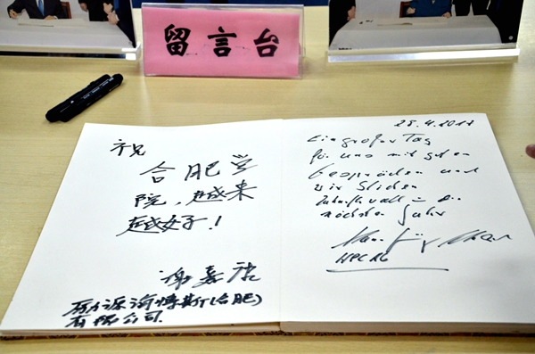 會(huì)談后,俞志敏代表合肥學(xué)院生物與環(huán)境工程系與勵(lì)源海博斯(合肥)環(huán)??萍加邢薰竞炇鹑婧献鲄f(xié)議。來賓一行還參觀了“中德共建合肥學(xué)院三十周年展”、合大環(huán)境檢測(cè)有限公司及我校分析測(cè)試中心。