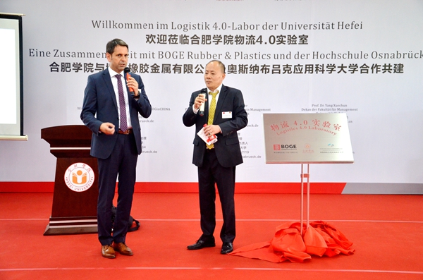 在由合肥學(xué)院、德國(guó)奧斯納布呂克應(yīng)用科學(xué)大學(xué)及德國(guó)BOGE公司合作共建的“物流4.0”實(shí)驗(yàn)室揭牌儀式上,合肥學(xué)院黨委書(shū)記蔡敬民致辭,對(duì)德國(guó)下薩克森州經(jīng)濟(jì)代表團(tuán)的到來(lái)表示由衷的歡迎。蔡敬民回憶了我校與德國(guó)奧斯納布呂克應(yīng)用科學(xué)大學(xué)的合作歷史,兩校30余年來(lái)在師生交流、科研合作、骨干教師培養(yǎng)、國(guó)際會(huì)議合作等領(lǐng)域開(kāi)展有全方位的合作。兩校共同申報(bào)的中德合作物流管理本科專業(yè)更是成為教育部批準(zhǔn)的安徽省首個(gè)中外合作辦學(xué)項(xiàng)目。此次中德合作“物流4.0”實(shí)驗(yàn)室的建立,旨在進(jìn)一步拓展校企合作領(lǐng)域,增強(qiáng)學(xué)生專業(yè)實(shí)踐能力。他表示,合肥學(xué)院愿意繼續(xù)為中德高校及企業(yè)間的合作不斷發(fā)揮優(yōu)勢(shì)。德國(guó)BOGE(中國(guó))公司代表王爾明對(duì)公司研究領(lǐng)域以及產(chǎn)能運(yùn)營(yíng)狀況做了簡(jiǎn)單介紹。他提到,公司對(duì) BOGE “工業(yè)4.0”現(xiàn)代化企業(yè)物流體系與中德合作“物流4.0”實(shí)驗(yàn)室之間的合作充滿期待,并邀請(qǐng)到場(chǎng)嘉賓訪問(wèn)BOGE公司、歡迎合肥學(xué)院學(xué)生赴BOGE公司就業(yè)。該實(shí)驗(yàn)室學(xué)術(shù)主任格斯寧博士就實(shí)驗(yàn)室具體情況、學(xué)生參與物流工具設(shè)計(jì)與控制的方式以及該實(shí)驗(yàn)室基礎(chǔ)上課程與實(shí)踐的深度融合等內(nèi)容做了深入介紹。隨后,在場(chǎng)中德嘉賓共同為中德合作“物流4.0”實(shí)驗(yàn)室揭牌。