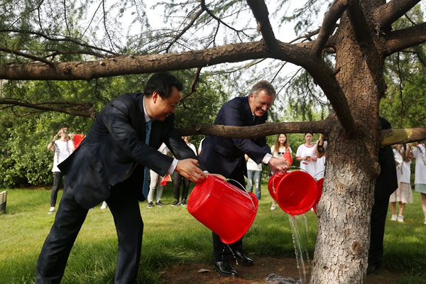 活動現(xiàn)場播放了武爾夫歷次訪問我校的視頻,為武爾夫慶祝生日并合唱獻花,氣氛熱烈。最后,武爾夫主席一行來到一期中德友誼樹前,踏過紅地毯,從等候在這里的合肥學院學生手中接過盛滿中德友誼和希望之水,將水澆向2005年第一次來合肥學院時親手栽下的友誼樹。據(jù)悉,武爾夫曾兩次訪問合肥學院,2005年5月,武爾夫在合肥學院種下了一棵象征中德友誼的常青樹——雪松,2008年10月在任德國下薩克森州州長時訪問安徽,再次來到我校進行訪問。九年來,友誼之樹茁壯成長,武爾夫先生是合肥學院全體師生最值得尊敬、最值得驕傲的德國友人。