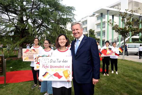 6月19日下午,充滿熱情和期盼的學生們站立在合肥學院圖書館報告廳大門兩側,手持中德兩國國旗熱烈歡迎武爾夫先生的再次到來。一路上,武爾夫主席多次駐足與師生代表親切交流。