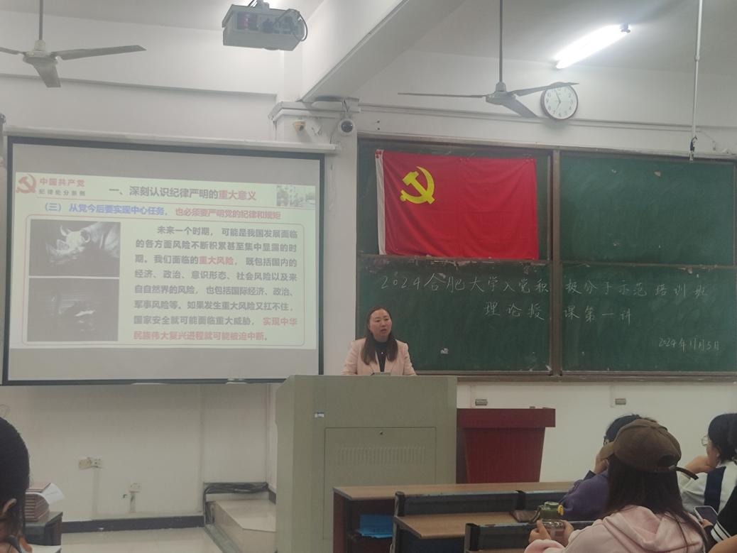 2024年11月5日晚,合肥大學(xué)2024年入黨積極分子示范培訓(xùn)班理論授課第一講在38棟3JT教室舉行,本次黨課由先進(jìn)制造工程學(xué)院黨委書記杜娟進(jìn)行授課,共75名黨校成員參加本次課程,黨課主題是“學(xué)黨規(guī) 守黨紀(jì) 爭做新時代好青年”。