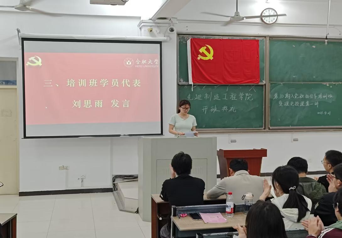 2024級機(jī)械電子工程劉思雨同學(xué)作為入黨積極分子代表發(fā)言。她談到,黨的事業(yè)崇高而偉大,前行道路充滿挑戰(zhàn)與機(jī)遇,需要每一位心懷赤誠的有志青年勇?lián)姑⒐碹`行。發(fā)言中,她向全體入黨積極分子發(fā)出倡議:在黨校學(xué)習(xí)期間,要以端正嚴(yán)謹(jǐn)?shù)膽B(tài)度投入學(xué)習(xí),珍惜這一淬煉思想、提升覺悟的寶貴契機(jī),以無畏的勇氣直面成長路上的挑戰(zhàn),始終以共產(chǎn)黨員的標(biāo)準(zhǔn)嚴(yán)格要求自己,在思想與行動上向黨組織靠攏,爭取早日成為光榮的共產(chǎn)黨員,為黨的事業(yè)貢獻(xiàn)青春力量。