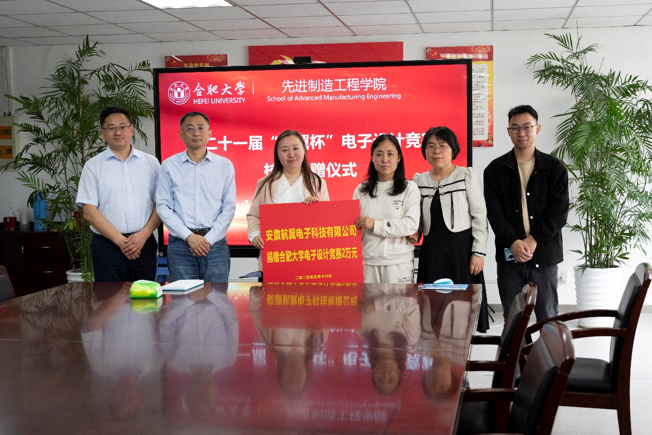 安徽航翼電子科技有限公司總經理張永麗、副總經理張翼、先進制造工程學院黨委書記杜娟、院長胡學友、副院長胡國華、電子設計競賽負責人李翠花等參加捐贈儀式。