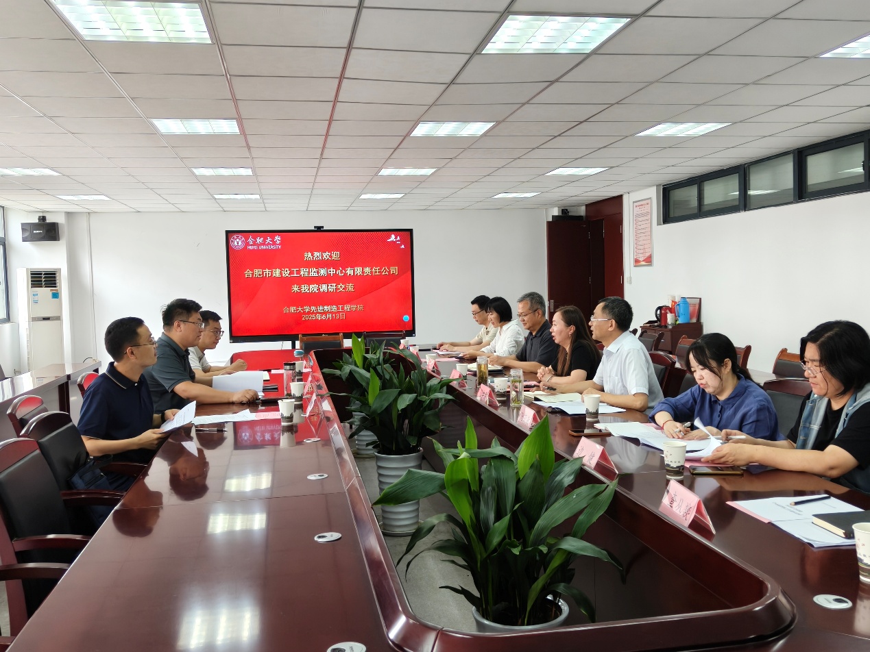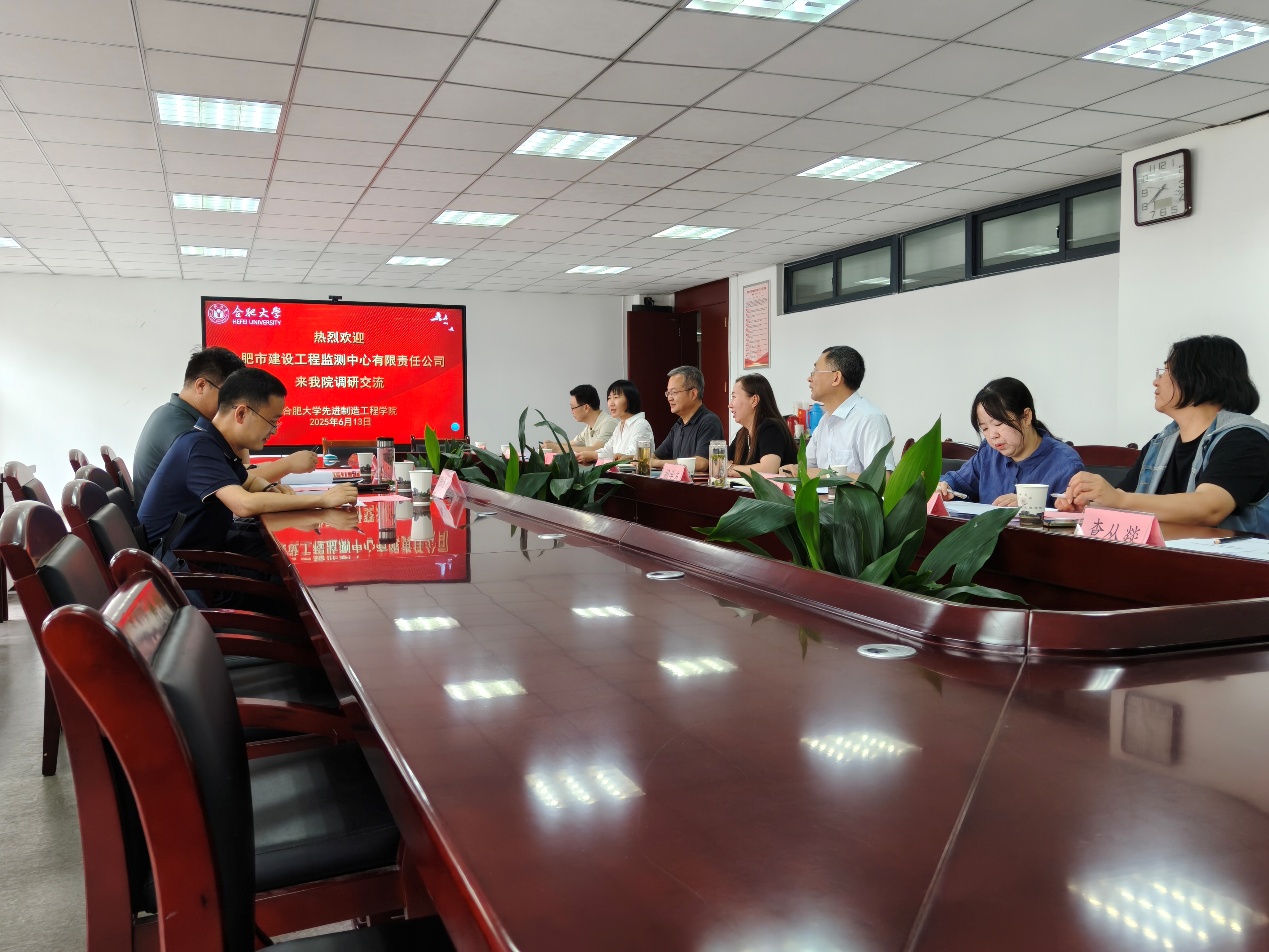 2025年6月13日上午,合肥市建設工程監(jiān)測中心有限責任公司董事長傅劍、新特所所長王俊以及張恩民一行來我院調(diào)研交流,交流座談會在40棟305會議室召開,先進制造工程學院黨委書記杜娟、院長胡學友、副院長秦強及多位教師參加會議。