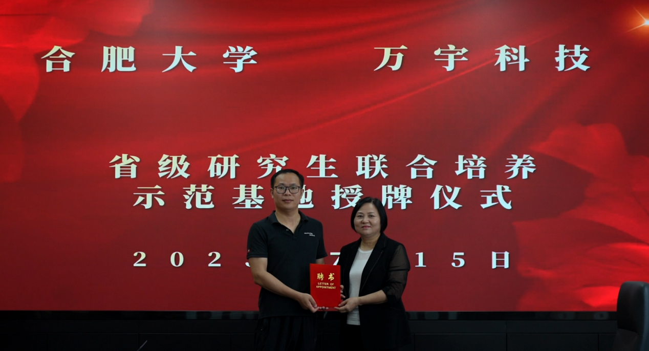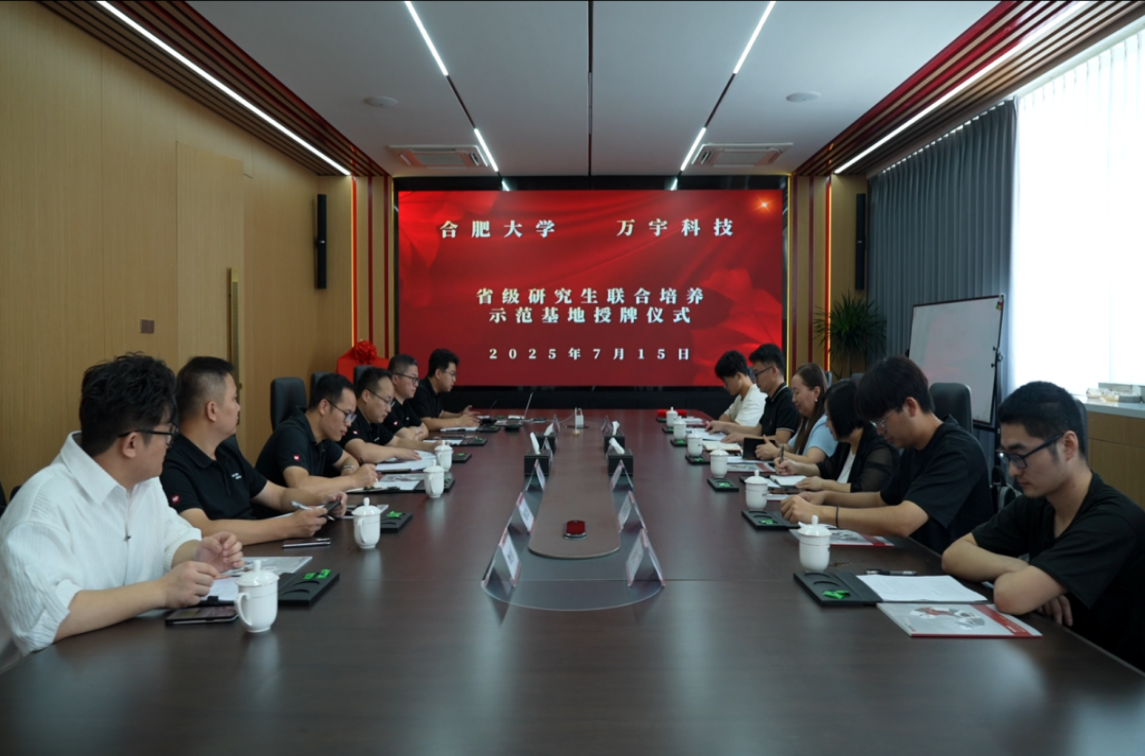 7月15日上午,合肥大學(xué)先進(jìn)制造工程學(xué)院與安徽萬宇機(jī)械設(shè)備科技有限公司(以下簡(jiǎn)稱“萬宇科技”)省級(jí)研究生聯(lián)合培養(yǎng)示范基地授牌儀式在公司會(huì)議室隆重舉行。儀式由萬宇科技董事長助理?xiàng)詈陦阎鞒郑f宇科技董事長萬龍、總經(jīng)理童志祥、學(xué)院黨委書記杜娟、黨委委員谷曼、機(jī)械系主任吳其林及雙方相關(guān)企業(yè)、師生代表出席了活動(dòng)。