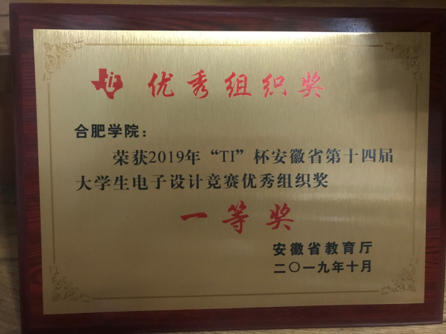 合肥學院榮獲2019年“TI”杯安徽省第十四屆大學生電子設計競賽優(yōu)秀組織獎一等獎,參賽學生榮獲安徽省一等獎4項,二等獎1項,三等獎5項。(先進制造工程學院李翠花