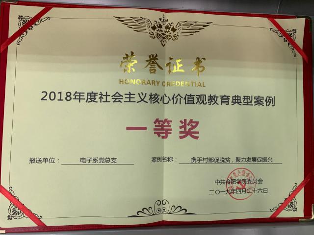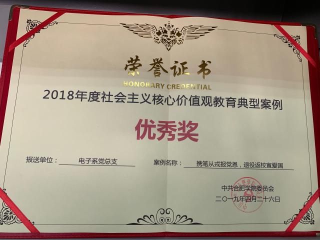 合肥學(xué)院2018年度社會主義核心價值觀教育典型案例評選中獲得一等獎1項(攜手村部促脫貧,聚力發(fā)展促振興),優(yōu)秀獎1項(攜筆從戎報黨恩,退役返校宣愛國)