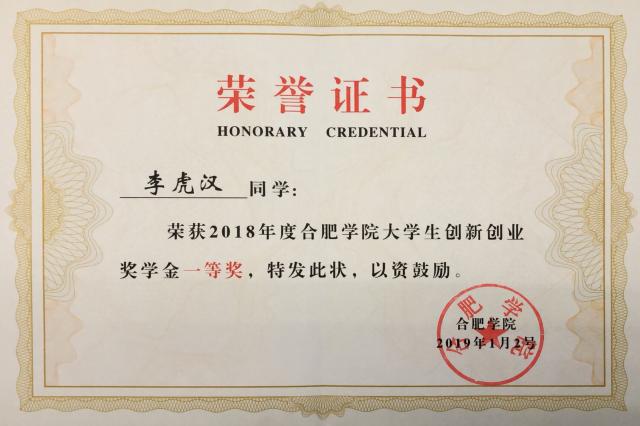李虎漢獲2018年校創(chuàng)新創(chuàng)業(yè)一等獎學(xué)金
