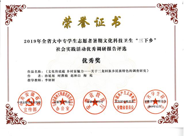 1、1月,我系赴惠廟村“青年觀察家”改革開放40周年專項調(diào)研團隊獲2018年全省大中專學(xué)生志愿者暑期“三下鄉(xiāng)”社會實踐活動優(yōu)秀實踐團隊;我系學(xué)生丁浩、徐亞根、王盛辰撰寫的2018年“青年觀察家”改革開放40周年專項調(diào)研報告獲2018年全省大中專學(xué)生志愿者暑期“三下鄉(xiāng)”社會實踐活動優(yōu)秀調(diào)研報告三等獎,李妍妍被評為最棒導(dǎo)師。(主辦方:中共安徽省委宣傳部、安徽省文明辦、安徽省教育廳、共青團安徽省委員會、安徽省學(xué)生聯(lián)合會)